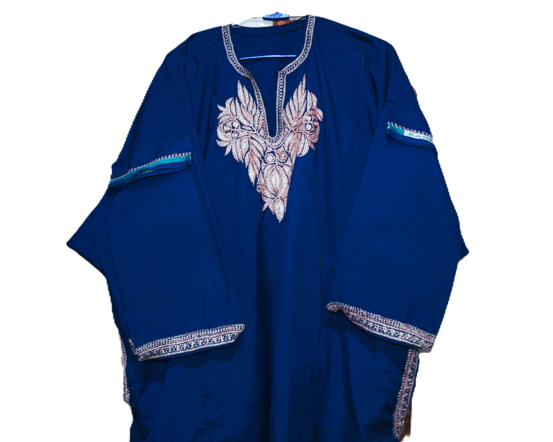 The Kashmiri Tilla Pheran is a traditional and elegant long robe worn by both men and women in Kashmir, adorned with intricate Tilla embroidery—a form of metallic threadwork using gold or silver threads. This attire reflects Kashmiri heritage and is often worn during festive occasions, weddings, and special gatherings